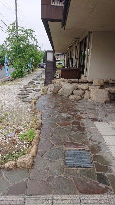 駐車場から館内へのアプローチは、風情のある白玉石に飛石です。